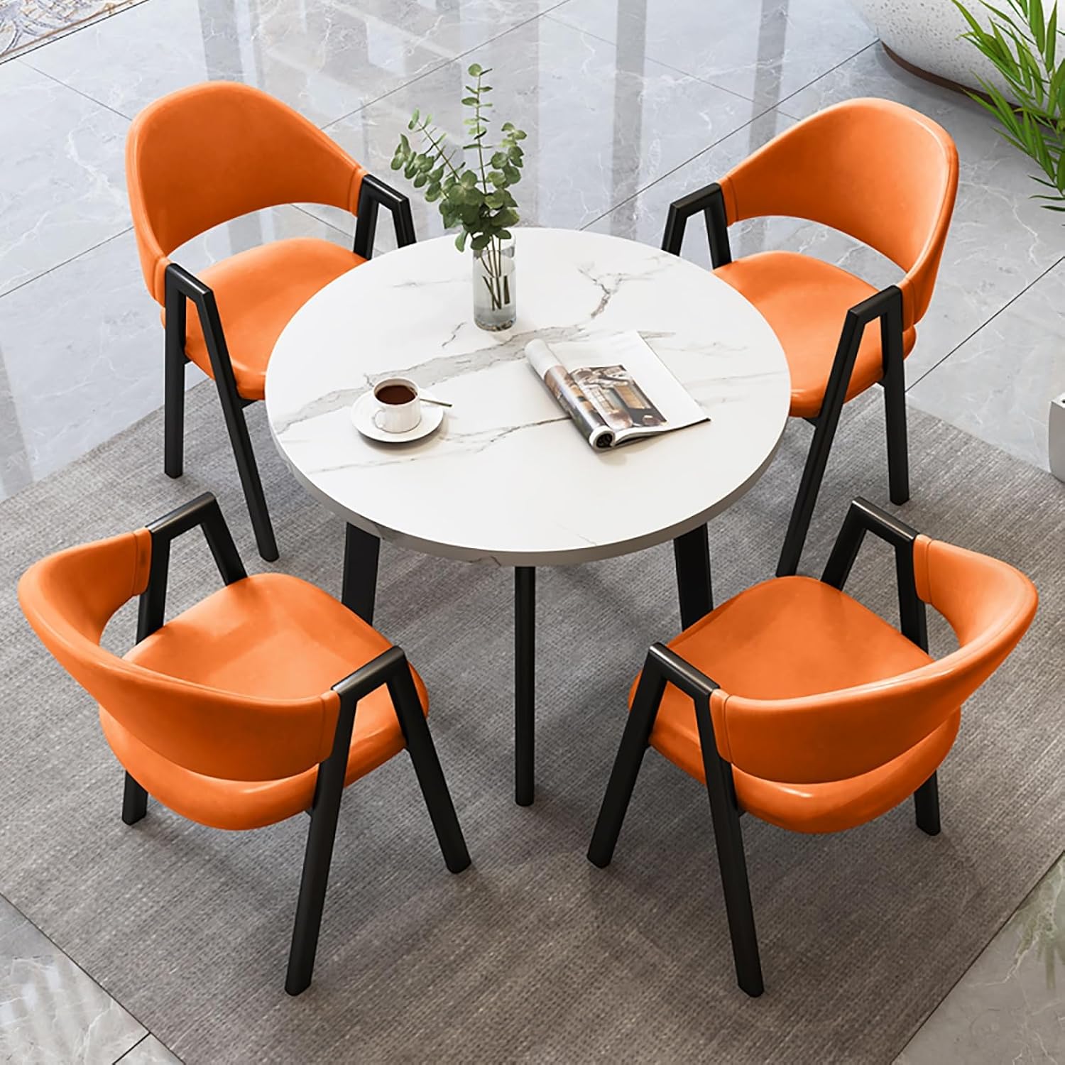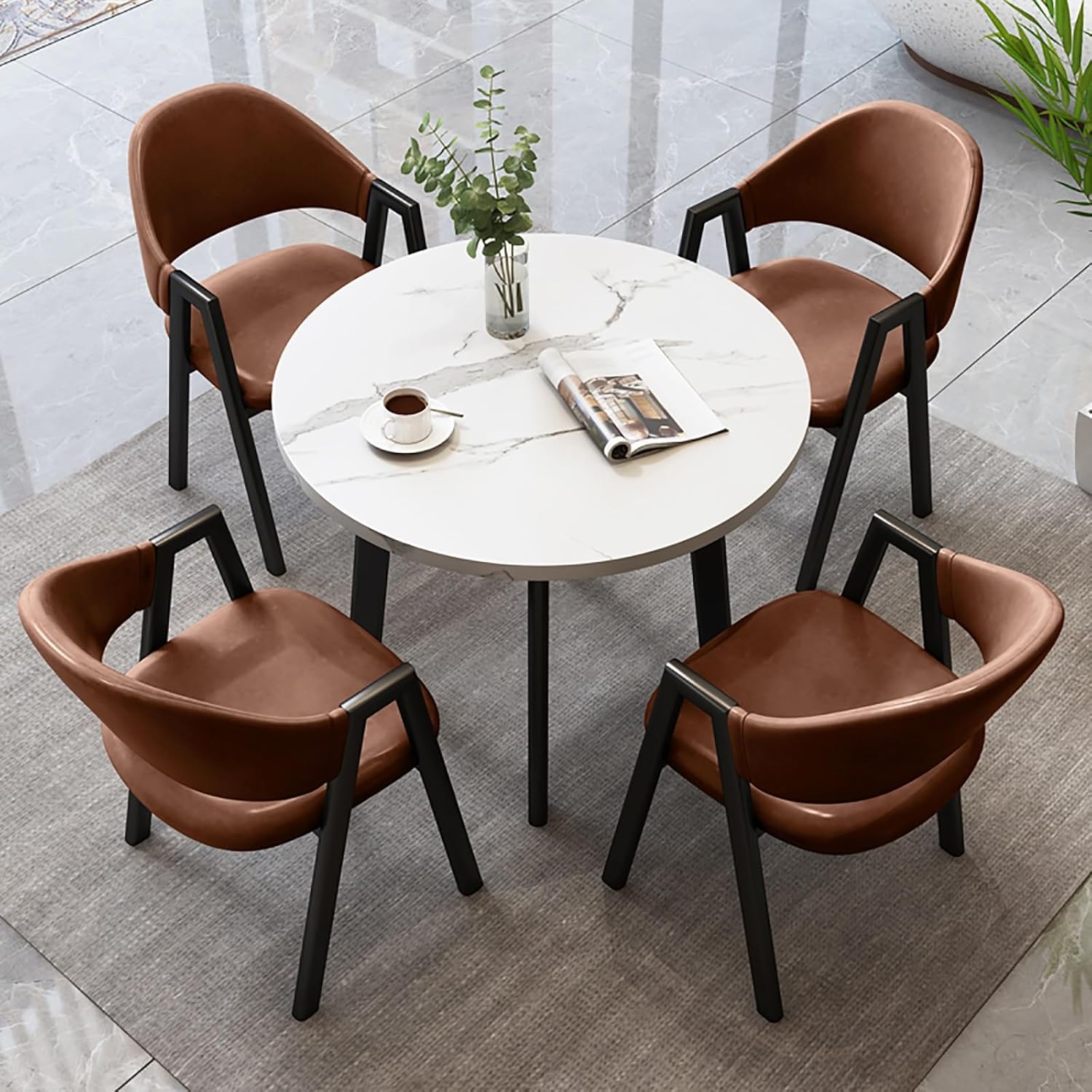 Modern Conference Table with Chairs Round Kitchen Desk Set Dining Table and Chair Set This Office Leisure Table and 4 Seats Round Dining Table and Chair Set is designed to cater to a variety of needs,whether you're hosting a casual coffee meeting,enjoying a family dinner,or creating a welcoming environment in your coffee shop. With its space-saving design,this Lounge Area Table and Chair Combination Set is for smaller spaces,allowing you to maximize your room's potential without sacrificing comfort or style. The round table promotes a sense of togetherness,making it easy for conversations to flow and ensuring that everyone feels included. Constructed with sturdy materials,the set offers practicality and stability,making it a long-lasting addition to your home or office. The sleek finish and modern aesthetic enhance any decor,ensuring it fits seamlessly into your lounge,living room,or commercial space. Each chair is ergonomically designed to provide maximum comfort,allowing you and your guests to sit back and relax,whether for a brief discussion or an extended gathering. With the Negotiation Table and Chair Combination,you can create an inviting atmosphere that encourages productivity and connection. Worried about assembly? Fear not! This table and chair combination is easy to assemble,with clear instructions that make setup a breeze. Spend less time assembling and more time enjoying your new furniture. Upgrade your space with this stylish and functional set that is for any occasion. Experience the combination of convenience,comfort,and contemporary design! Specifications: Material: Engineered Wood,MDF Package Includes: 1 x Dining Table Set with Chairs Notice: Slight color variations may occur due to display differences. Product dimensions may have slight errors due to measuring tools and methods. Decor elements shown are not included in the package.